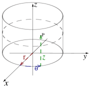 The cylindrical coordinate system is a three-dimensional extrusion of the polar coordinate system, with an z coordinate to describe a point's height above or below the xy-plane. The full coordinate tuple is (r, φ, z).