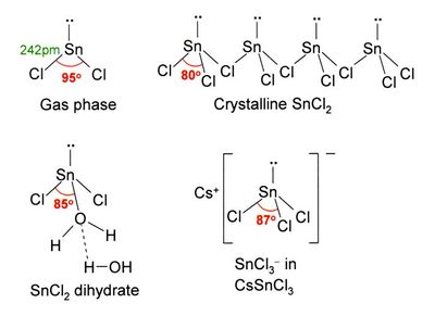 SnCl2 has a lone pair of electrons, such that the molecule in the gas phase is bent. In the solid state, crystalline SnCl2 forms chains linked via chloride bridges as shown. The dihydrate is also three-coordinate, with one water coordinated on to the tin, and a second water coordinated to the first. The main part of the molecule stacks into double layers in the crystal lattice, with the "second" water sandwiched between the layers.