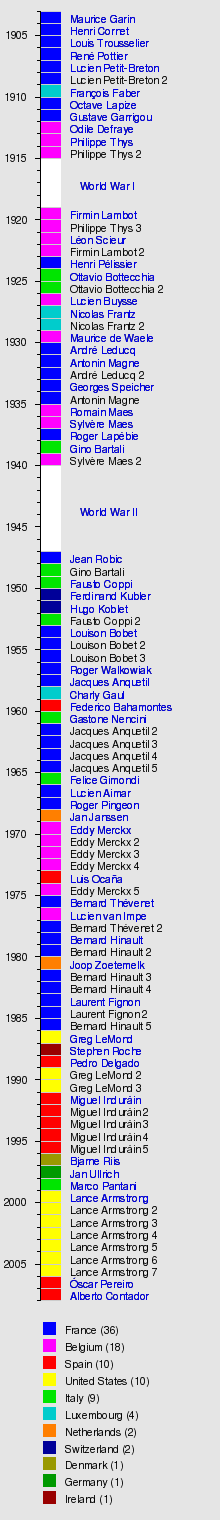 - Lance Armstrong (USA) in 1999, 2000, 2001, 2002, 2003, 2004, and 2005 (seven consecutive years).