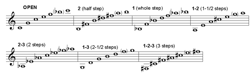 Note that the fundamental of each overtone series does not exist - the series begins with the first overtone. Notes in parentheses are the sixth overtone, representing a pitch with a frequency of seven times that of the fundamental; while this pitch is close to the note shown, it is slightly flat relative to equal temperament, and use of those fingerings is generally avoided.