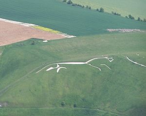 It is quite similar to horses depicted on pre-Roman British coinage and the Marlborough bucket. For centuries, however, local people have maintained that it is a portrait of the dragon slain by Saint George on the nearby Dragon Hill.