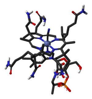 Vitamin B-12, known also as vitamin B12 (or commonly B12 or B-12 for short), is a collection of cobalt and corrin ring molecules which are defined by their particular vitamin function in the body. All of the substrate cobalt-corrin molecules from which B-12 is made must be synthesized by bacteria. However, after this synthesis is complete, the body has a limited power to convert any form of B-12 to another, by means of enzymatically removing certain prosthetic chemical groups from the cobalt atom.