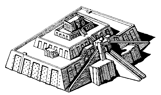 )所建的庙塔重绘。各平台有不同的颜色(黑、红、蓝),塔顶之殿则铺上银。