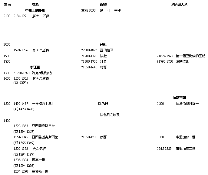 注: 这个图表旨在把同期发生的事件并排在一起,而不是显示立国的经过或征服的进度。有关以色列史的简图,见“以色列史的简化图”。