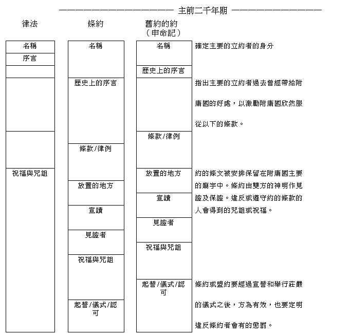 主前二千年期早期的法典(第一栏),通常以赞美宣告以下的新律法的君王之名称及序言开始。跟着,就记载对守律法者的祝福及破坏律法者之惩罚。第二栏显示的条约形式较复杂,但却是主前二千年期后期的约一贯的形式。首先是名称,确定主要的立约者的身份。跟着是历史的序言,指出主要的立约者,过去曾经带给附庸国的好处,以激励附庸国欣然服从以下的条款。约的条文被安排保留在附庸国主要的庙宇中,以供当地人民经常阅读,提醒他们有关的条款。条款由双方的神明作见证及保证,要对遵守或违犯条约者加以祝福或惩罚。任何条约或盟约均需经过宣誓和举行庄严的仪式,之后方为有效,也要定明违反条约者会有的惩罚。