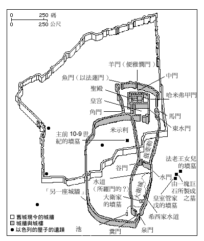 从所罗门至希西家王时代的耶路撒冷,显示出西面与北面的扩建,包括圣殿一带的扩建。