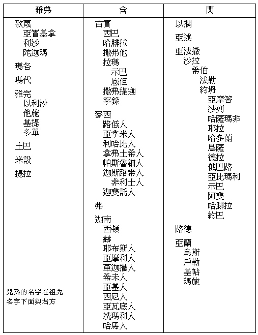 根据创十记载的列国名单,列出挪亚的儿子闪、含、雅弗的后裔。