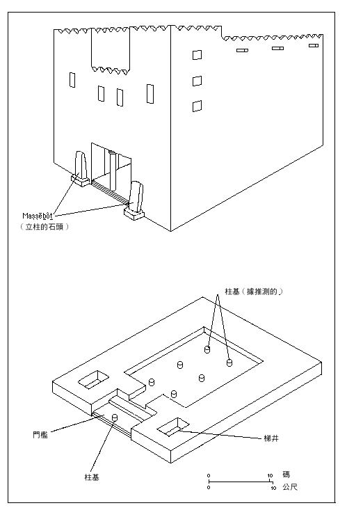 图 在示剑发掘出的早期堡垒式庙宇据建议的重构图及平面图