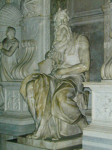 ¤T¤Q¥|29¡@¼¯¦èªº¡u¨¤¡v¡@¼¯¦è§âªkª©±a¦^¨Ó®É±¥Öµo¥ú¡A¤Ï¬M¯«ªº¥ú½÷¡C¥L¦Û¤v°_¥ýÁöµM¨S¦³¯d·N¨ì³oÓ²{¶H¡A«á¨Ó«o»P¦Ê©m¤@¦PÁA¸Ñ¨ì³o¬O¥Lª½±µ»P¯«±µÄ²ªºÃÒ©ú¡C¦¹«á¥Ln»X°_±¨Ó¡A¨Ï¦Ê©m¬Ý¤£¨£¥L±¥Ö¤Wªº¥ú½÷¡CC¬X¦Ì¡]Jerome¡^½ĶªZ¥[¤jĶ¥»®É¡]¬ù¥D«á400¦~¡^¡A±N§Æ§B¨Ó»yªº qaran¥ú½÷¡Aͧ@©Ô¤B»yªº¨¤¡]cornuta¡^¡A¦]¬°³oӧƧB¨Ó¦r²´¸g±`¥i«ü¡u¨¤¡v¡C¬G¦¹¶Ç²Îªº»¡ªk¡A¬O¼¯¦èªº¸g¾ú¥O¥Lªø¤F¨¤¡C³oÓ¿ù»~Æ[©À¾ÉP¦Ì¶}Äõ°òù¡]Michelangelo¡^¦b¤Q¤»¥@¬ö¡AÀJ¨è¤F¦³¨¤ªº¼¯¦è¹³¡C