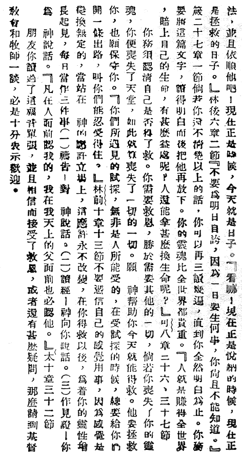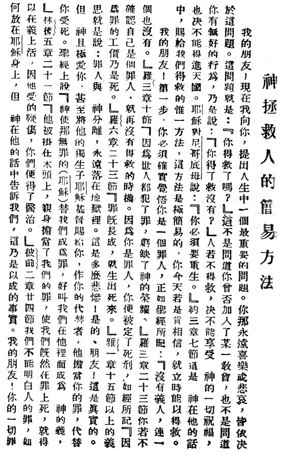 生死存亡的大事朋友!我要問你人生中最最重要的問題,它是與你永遠的喜樂或悲傷緊密相連的。這個問題就是:「你得救了嗎?」 這不是問你有沒有行善,也不是問你有沒有加入教會,而是問你有沒有得救,也就是問你能不能肯定,你死了以後一定會上天堂。 真神耶穌在聖經的約翰福音3:7中說,為了能上天堂,「你們必須重生。」 聖經把使人得救的方法告訴我們,讓我們知道如何重生和得救。神的方法很簡單,你現在就可以得救。你願意嗎? 朋友!首先,你必須認識到你是個罪人。(聖經裡講的罪比中國人理解的罪意義更為廣泛,它不但包含了人的刑事罪,也包含了一切達不到神標準的人的意念和行為)羅馬書3:23說:「世人都犯了罪,虧缺了神的榮耀。」 因為你是個罪人,所以完全聖潔的神判了你死刑。羅馬書6:23說:「罪的工價乃是死。」 這包括了在地獄裡與神永遠隔絕,受永火的刑罰。 希伯來書9:27說:「按著定命,人人都有一死,死後且有審判。」 然而神卻非常愛你,他甚至把自己的獨生愛子耶穌基督都賜給了你,使他擔當你的罪,替你死。 哥林多後書5:21說:「神使那無罪的(耶穌)替我們成為罪,好叫我們在他裡面成為神的義。」