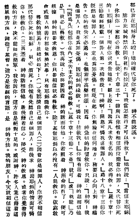 耶穌為我們流血而死,因「活物的生命是在血中。」(利未記17:11)所以 「惟有基督在我們還作罪人的時候為我們死,神的愛就在此向我們顯明瞭。」(羅馬書5:8)雖然我們無法理解,神如何把我們的罪放在那完全無罪的耶穌身上,讓耶穌替我們死;然而耶穌的確替我們死了,這是真的,因為神絕不會撒謊。 朋友!現在「神…吩咐各處的人都要悔改」(使徒行傳17:30)。這個悔改就是要求我們在思想意念上來個根本轉變,同意神的看法:我們都是罪人,而耶穌為我們的罪釘死在十字架上。 腓立比城的禁卒問保羅和西拉說:「『我當怎樣行才可以得救?』他們說:『當信主耶穌,你…必得救.』」(使徒行傳16:31) 所以你只有相信那位擔當你的罪,替你死而埋葬,神使他從死裡復活的耶穌,才能得救.凡接受耶穌為救主的人,耶穌復活的大能,就能確保他獲得永生。約翰福音1:12說:「凡接待他的,就是信他名的人,他就賜他們權柄,作神的兒女.」。羅馬書1:13說:「凡求告主名的,就必得救.」 這個「凡」就包括了你。「就必得救」的意思不是「可能」或「就能」得救,而是「必定得救」。 你需要認清自己是個罪人,不管你在哪裡,你現在就應當立即悔改,通過禱告,把你的心交託給神。 在路加福音18:13中,有個罪人向神禱告說:「神啊,開恩可憐我這個罪人!」你也需要傚法他作這樣的禱告:「神啊,我知道我是個罪人。我信耶穌替我死在十字架上,我信耶穌為我流血、受死、埋葬和復活。我現在願意接受他作我的救主。我感謝你赦免了我的罪,賜給我救恩和永生。阿們。」 你只有藉著對神話語和救恩的信心才能得救。除此之外,任何教會或善行等都不能救你。神已完成了救恩的全部工作,只需要我們去信靠他,接受他的救恩就夠了。 神救人的簡易方案可概括如下:你是個罪人,你若不肯信耶穌,信他為你的罪而死,你就只有在地獄裡受永火刑罰的痛苦。你若信耶穌為你釘十字架、埋葬、復活,信耶穌是你的救主,你的罪就都會得到神的赦免,憑信心得到了神所賜的禮物---永遠的救恩,即永生。 可能你會說:「得救絕不會如此簡單。」 可是實際上就是如此簡單,因為聖經對這個問題講得很清楚,這就是神的計劃。朋友!請你現在就相信並接受耶穌作你的救主。如果你對上面的話還不十分明白,希望你能夠多讀幾遍這個福音單張,直到你能夠完全明白為止。你的靈魂比全世界都寶貴。「人就是賺得全世界,賠上自己的生命,有什麼益處呢?人還能拿什麼換生命呢?」(馬可福音8:36-37)你需要肯定自己是否已經得救,如果你的靈魂失喪,上不了天堂,你就失去了一切。願神使你現在就得救。神有能力救你,也有能力保守你,使你過得勝的生活。「你們所遇見的試探,無非是人所能受的,…在受試探的時候,總要給你們開一條出路,叫你們能忍受得住。」(哥林多前書10:13)不要憑自己的感覺定是非,因感覺是變換無定的,我們必須站在神的應許上。神的應許是永不改變的。在你得救以後,為了使你靈性長進,你每天應當作三件事:(1)禱告---你對神說話。(2)讀聖經---神向你說話。(3)作見證---你為神說話。 你需要毫不遲延地聽從主耶穌基督的命令去施浸禮,公開見證你的救恩,然後加入一個信仰聖經的教會。「你不要以給我們的主作見證為恥」(提摩太后書1:8)。 「凡在人面前認我的,我在我天上的父面前也必認他。」(馬太福音10:32) 下面再列舉一些聖經經文,供你參考。相信對於你的信仰一定會大有幫助的:約翰福音3:16;彼得前書2:24;以賽亞書53:6;雅各書1:15;羅馬書10:9-10;以弗所書2:8-9);箴言27:1;哥林多前書15:3-4;約翰福音10:27-30;約翰一書5:13。
