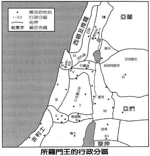新的分區有助於統一收稅及徵召勞工。這制度顯然是所羅門創始的,並非受到埃及的影響159。所羅門試圖儘量保持支派分區(Ⅰ、Ⅱ、Ⅹ、ⅩⅠ),納入鄰近新占領的舊迦南區域(Ⅱ、Ⅳ、Ⅴ),並作適度調整,以便將外族因素納入王國勢力範圍之內(Ⅵ、Ⅶ、Ⅸ、ⅩⅡ)。參考對頁的地圖。這個計畫並不是為了剝削每一地區幾乎均等的經濟潛力而設,也不是故意要削減支派家族的獨立性,特別是「約瑟家」。這個新的制度乃由早期的作法發展而成,基本上一直沿用到分裂王國時期結束均未改變。其地理分布大概是順著中央(Ⅰ-Ⅴ)、約但河外(Ⅵ-Ⅶ)、北部(Ⅷ-Ⅹ)及南部(ⅩⅠ-ⅩⅡ)160。