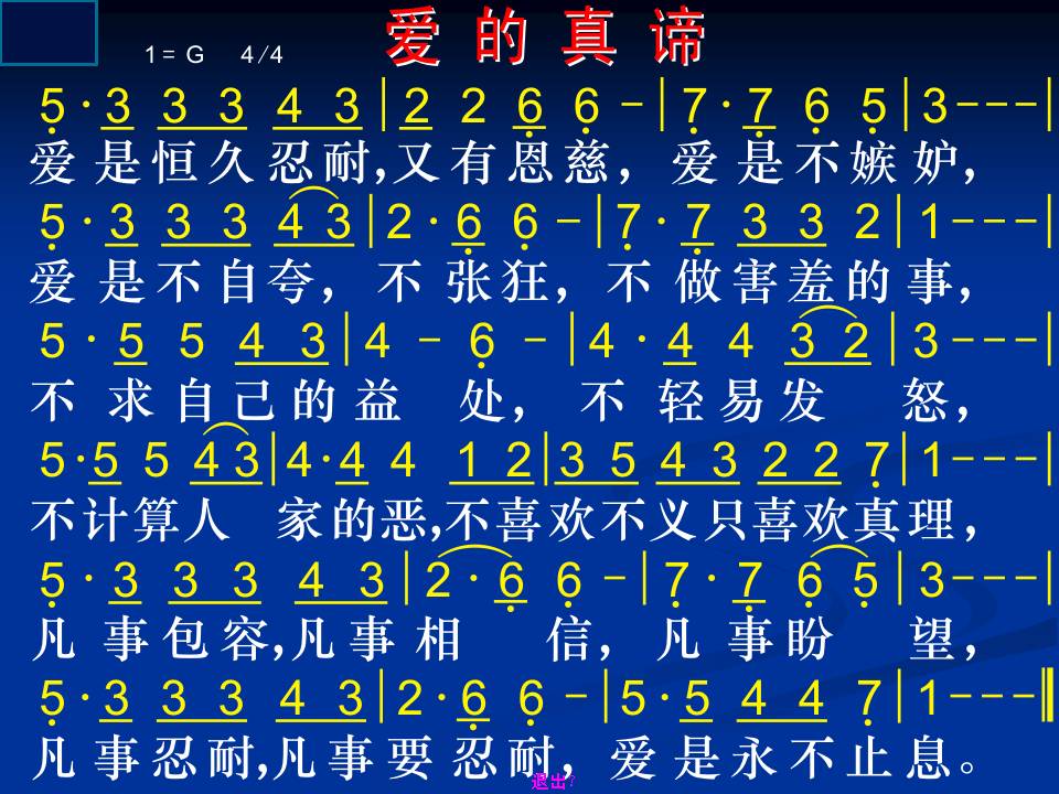 愛是恆久忍耐,又有恩慈; 愛是不嫉妒;愛是不自誇 ,不張狂,不做害羞的事,不求自己的益處, 不輕易發怒,不計算人家的惡, 不喜歡不義 ,只喜歡真理;凡事包容,凡事相信, 凡事盼望,凡事忍耐, 愛是永不止息。