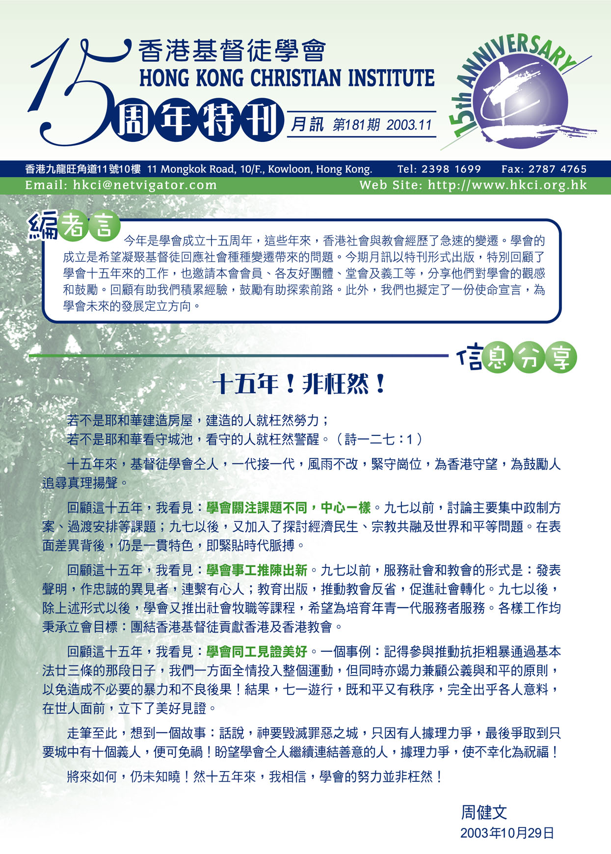 十五週年使命宣言及活動消息