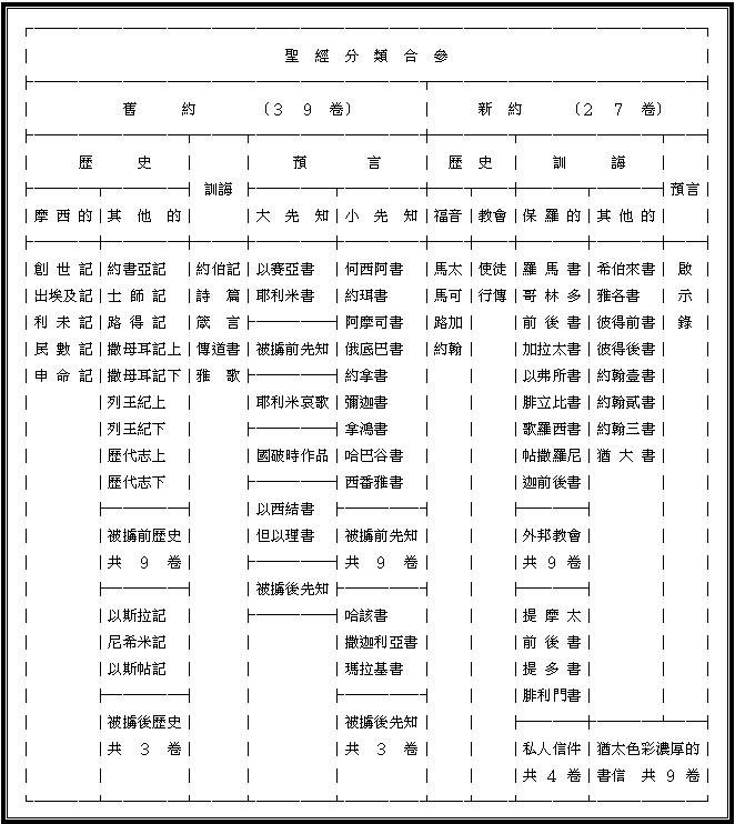 經主耶穌的見證,太五:17,將舊約分為律法書及先知書,主說律法的一點一劃都不能廢去,並要成全律法。路廿四:44-45,主耶穌更看重詩篇的重要。新約作者們的承認及引用,提後三:16,彼後一:20-21,......2)新約: