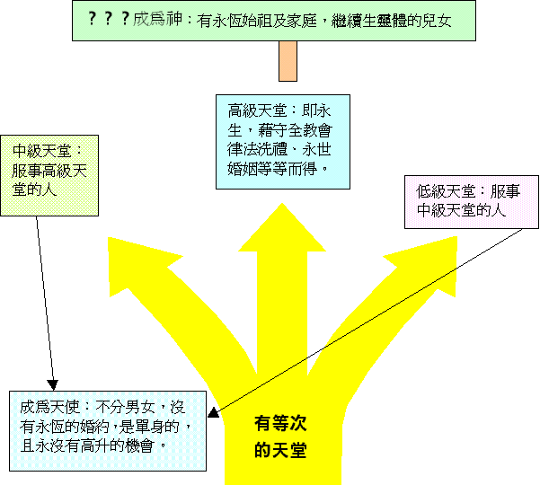 聖經沒有三等天堂之分,這只是人的自高的心理作崇。他們所根據三層天的話而推論三等天堂是不合理又荒謬的事,並且婚禮是否比救贖及 神的主權更重要呢?4)聖職: