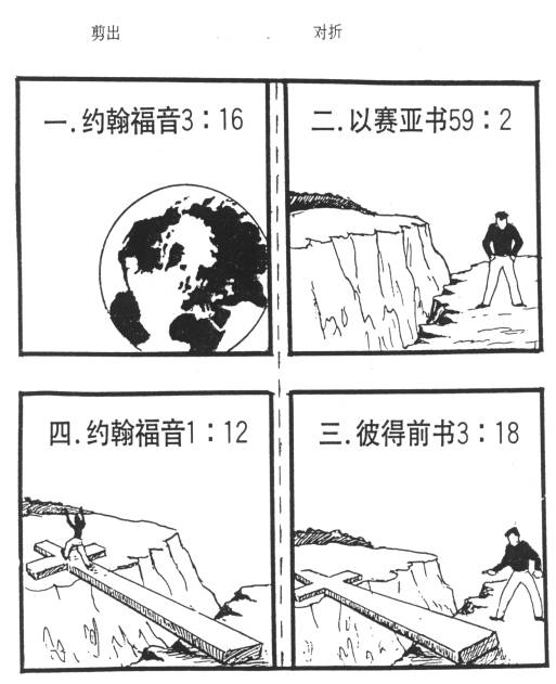 一.把图一指给朋友看,并念读出约翰福音三章十六节,