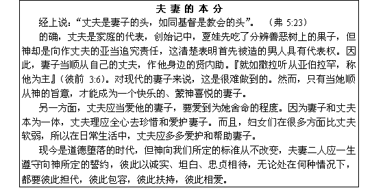 【新生活】(33)家庭生活 『教会这样顺服基督,妻子也要这样凡事顺服丈夫。你们作丈夫的,要爱你们的妻子,正如基督爱教会,为教会舍己。』 弗5:24,25 |