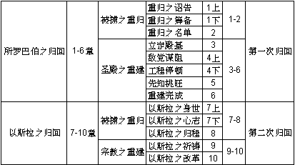 6. 建殿完成 7. 以斯拉归回 8. 以斯拉之归程 9. 以斯拉之祈祷 10. 以斯拉之改革 |