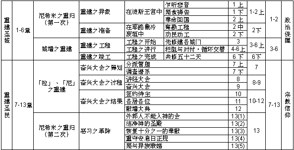 1. 尼希米禁食祈祷 2. 获准归回,踏勘城垣 3. 修建城门 4. 遭敌拦阻 5. 百姓埋怨 6. 工程完成 7. 稽核回归者之家谱 |