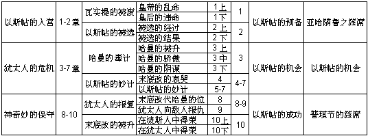 6. 失眠的王 7. 以斯帖二次款待哈曼 8. 以斯帖求废哈曼恶谋 9. 普珥日的故事 10. 末底改擢升为相 |