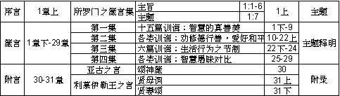 1. 智慧的开端 2. 智慧如珍宝 3. 专心仰神 4. 保守你的心 5. 远避淫妇 6. 神的七憎恶 7. 远离淫妇 8. 智慧的本源 9. 智慧的开端 10. 各类智言慧语(爱恨与善恶) 11. 各类智言慧语(恶人与义人) 12. 各类智言慧语(谎言与良言) 13. 各类智言慧语(恶善的果报) 14. 各类智言慧语(正人与正路) 15. 各类智言慧语(财宝与生活) 16. 各类智言慧语(交托与自谋) |