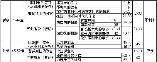 35. 向利甲族的预言 36. 耶利米书被焚 37. 耶利米被禁 38. 耶利米被释 39. 巴比伦灭犹大 40. 耶利米选留下 41. 基大利被杀 42. 约哈难问耶利米 43. 耶利米下埃及 44. 劝逃埃者听神 45. 巴录「蒙召」 46. 论埃及 47. 论非利士 48. 论摩押 49. 论各小国 50. 论巴比伦 51. 论巴比伦 52. 犹大之灭亡与被掳王之情形 |