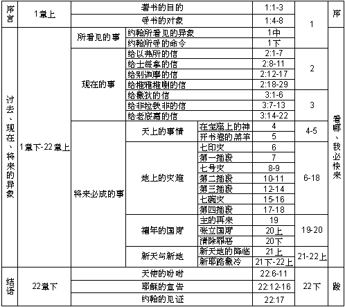 1章 拔摩岛的异象 2章 七教会:「以」、「士」、「别」、「推」 3章 「撒」、「非」、「老」 4章 神的宝座、羔羊与廿四长老 5章 七印书 6章 六印灾 7章 十四万四千见证人与灾难信徒 8章 第七印灾与前四号筒 9章 第五、六号筒 10章 约翰吃小卷 11章 两见证人与第七号筒 |