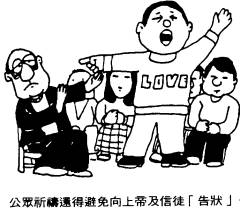 公众祷文还得避免向上帝及信徒「告状」或乘机作「教训」他人的祷词,一切不恰当的祷告内容,很可能成为破坏团契(基督身体)的利刃,以致无法达到与主生命合一的效果,上帝是不会「欣赏」这般的祷告的,因为如此的祈祷已失去了「圣洁」的成份(希伯来书十二14)。