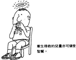 一名真实重生得救的儿童亦可领受圣餐。儿童主日学大都缺乏洗礼和领受圣餐的实际教导,儿童平日至多由成人的圣餐崇拜中略有片断的认知。有些孩童甚至好奇而有争着吃饼和喝杯的动作,造成崇拜之中小小的混乱。事实上,儿童主日学的合班崇拜,是教导洗礼和圣餐的好时机,主日学教师可以「联合教学」的方式,作洗礼和圣餐的崇拜教学示范,慎重且敬虔地邀请儿童思考个人与主的关系,鼓励儿童接受耶稣基督作其个人生命的主,以有份于主生命的团契和爱筵。