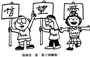 1.「信」:包括了对上帝的信心和对自己的信心。人若对上帝充满了信心,即可胜过恐惧、焦虑、沮丧、抑郁等的病态情绪;对自己充满信心(不是自傲的),亦将能克服自卑、恶已等负面的情绪,使生活保持在美好的适应状况中;这样的人必定是一个「应定」、「富弹性」,且能在客观的思想中坦然接受调整的人。信心是充实基督徒喜乐生活的重要元素之一。