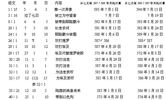 研究表明,《以西结书》中所有的日期都与约雅斤的被俘有关。这样,芬那根(Finegan)列出了下面这张表: