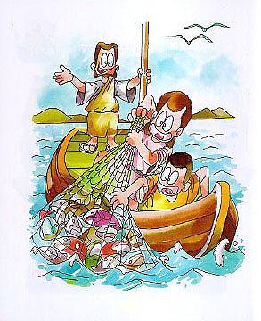 耶稣开始了他的工作。一天,他来到革尼撒勒湖边,一大群人跟着他。湖边有两只小船,他就上了西门和安德烈的船,向众人讲道。讲完便对西门说:“把船开到水深的地方,必大有收获。”西门说:“我们劳累了一夜什么也没打到,你既然这样吩咐,我就下网吧。”说罢就撒网,往上拉时满网都是鱼,拉也拉不动,他们只好叫另一只船上的雅各和约翰来帮忙。两只船都装得满满的,几乎要沉下去。看到这情景,船上的人都目瞪口呆。这时,耶稣对西门说:“不要怕,从今以后,你得人要像你现在得鱼一样。”四个人就撇下一切,作了耶稣的门徒。后来耶稣又召腓力和拿但业他们也欣然跟随了主。