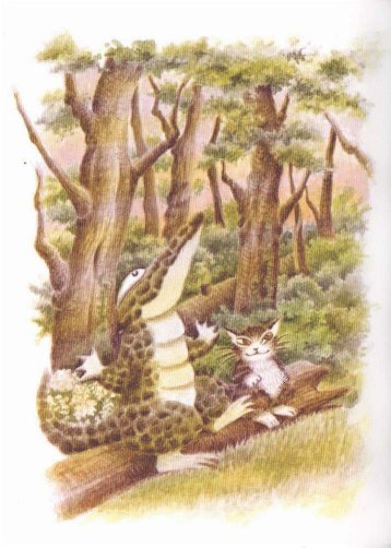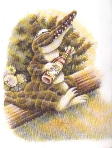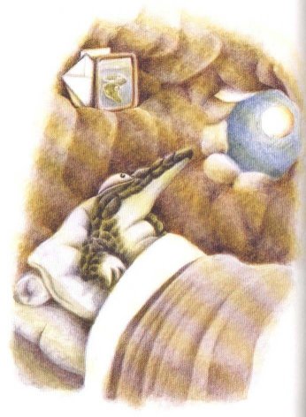 ——休比耳先生盯著鱗片, 思索了一會兒, 接著拿出秤來秤我的重量。 只見他努力睜大他的昏花老眼, 仔細瞧著上面的刻度。 「可能會超重吧…… 咦,重量還可以。」 嘻嘻!看看我的尾巴, 正悄悄地頂在地上呢! 鱷魚的尾巴可是非常強而有力的喲! |