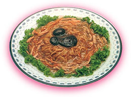 | 作法: | 青江菜炒熟後排在盤中備用。筍 絲油炸至黃金色後,下鍋紅燒, 置於小碗蒸約30分鐘,然後倒置 青江菜盤中。素魚翅,NBP素肉 絲煮炒勾芡後淋在盤中即成。 |