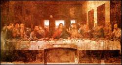当达文西画他有名的「最后晚餐」壁画时,年 45 岁。 其实起草图,达文西至少用了二十年的时间,真正开始绘画,则用了三年时间。 这么长久的时间,达文西到底在思索什么? 达文西在思索当耶稣说「你们之中有一个人要出卖我」这句话时,大家的反应。在七嘴八舌、议论纷纷之际,这幅画显露出最多的心灵深处的灵魂。 光看手姿的多样化: 巴多罗买双手按桌,小雅各和安得列的手呈现怀疑,彼得转身时手握餐刀,犹大捏紧的手中握住赏钱,约翰清白的手,耶稣摊开的手,多马竖指发问,大雅各张开双臂,像在进行辩解,非利扪心自问表白的手势,马太、西门和达太相互问询,显的无辜的手伸向基督。 对达文西而言,最难的是出卖者犹大与基督的表情。达文西为了找到犹大的灵感,街头巷尾到处观察市井小民与无赖、流浪汉,最后达文西说,12门徒已用尽灵感,不知如何描绘耶稣。 的确,跟12门徒相比,耶稣的确画的最不出色,我们只知道达文西企图将基督画成悲伤与顺从、而非英雄的模样。 「最后晚餐」这幅画有几个特点,譬如所有人物全没有圣光,强调现实生活、普普通通的人。连耶稣头上都没有圣光,达文西仅只用透视法,让耶稣成为中心,用窗口之光取代圣光,并使犹大背光置身黑暗中。犹大也不像传统般与耶稣众门徒分开,而是放在众人之中,甚至靠近耶稣,以使主题更戏剧性:我身边的人要卖我。 因此我们可以据以判断,达文西透过这幅画,其实就是要发挥文艺复兴时代最重要的、据以反叛前时代的主题「人生与人性」。 而达文西的困境,也在于他这人文主义的特质。既为神子、又为人的耶稣,该如何表达? 哥德时期,也就是文艺复兴初期,画家们仍受中古绘画观念的影响,将耶稣与马利亚描绘的只有其神性,其人性特质包括痛苦、哀伤、惊惧....全淡化到难以察觉,甚至肉体都轻飘飘仿佛是个灵体。 而文艺复兴晚期,却出现完全相反的状况,将耶稣的人性特质凸显到难以察觉祂还是神的儿子。 这状况到经历宗教革命的荷兰画家布勒哲尔,已经是完全否认耶稣的身为神子的特质了。