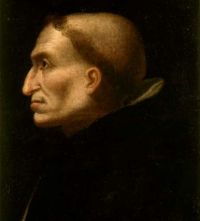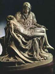 米开朗基罗一样是集雕刻家、诗人、艺术家于一身的典型文艺复兴时代的人文主义者。 他比达文西、拉斐尔都多了太多的冲突与矛盾。一方面他支持佛罗伦斯走向市民社会;但他的艺术支持者,却被迫是屡屡破坏市民社会的教皇。一方面,他受萨佛纳罗拉(自由传教者,曾短暂主持佛罗伦斯市政,典型清教徒思想,可算是中世纪思想的残存者)的信仰影响;但他骨子里却有艺术家热爱生命、自由的信念。一方面他爱佛罗伦斯;但他最重要的艺术作品,却都是出自罗马。他老是觉得有人要迫害他毒死他、相信自己一定活不久;但他却是文艺复兴三巨匠中,活的最久的,共活了89岁。 当劳孔父子雕刻(BC200-50)于1506挖出时,米开朗基罗亲临现场观赏。这个企图拯救特洛伊城而泄密、被诸神惩罚让大蛇咬死的孔劳父子悲剧,不知名的雕刻家将之雕刻的十分传神,从面目表情、到肌肉肢体的挣扎,全呈现出剧烈之痛苦与恐惧。 米开朗基罗深受这雕刻作品的震撼,而他早期的艺术作品,的确充满与上帝搏斗的意志。