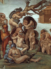 譬如他的大卫像,原本是个形状奇特数百年没人想用的大理石,米开朗基罗巧夺天工雕刻成大卫像。米开朗基罗却是用大卫战胜巨人哥利亚的圣经故事,暗喻动荡不安的佛罗伦斯面临外来强敌(神圣联盟与麦第奇家族),最终一定会是市民胜利。因此这大卫像充满人文主义的精神,奋发向上与命运搏斗的激昂。 可是同时期雕刻的圣母悼子,却又充满清教徒式的思想。当人家质疑圣母太过年轻时,他的回答是:「贞洁的妇女会比较容易保持青春,没有淫乱钻进心胸的妇女,身体是不会受多大影响的,我也相信,上帝会用这样的方式让她证明自己的贞洁。」 这种人文主义者与清教徒的心灵冲突,意味着米开朗基罗的心灵世界,永远不可能摆脱宗教信仰的强烈影响力。的确,晚期的「最后审判」将再现这种冲突。 西斯汀礼拜堂天花板的创世纪系列,一样是在宗教画中暗指人文主义的精神。 其实整个绘画过程就是一场激战与奋斗。 米开朗基罗说:「我是被迫的,我的艺术是在敌视的环境中成长的。」 因为爱其才的教皇朱力阿斯二世,却跟他个性相克水火不容,而米开朗基罗刁钻难相处的个性,也造成他四面受敌的窘境。 我们会发现,米开朗基罗透过创世纪,几乎是控诉上帝毁灭与严厉的属性,他宣告毁灭的命运,而不是爱的福音。 首先他绘出上帝创造天地的全能与威严。但创造亚当时,上帝与亚当的手若即若离,这已暗示出人类未来的命运。 当亚当夏娃被逐时,夏娃羞惭,可是亚当却愤怒无比的向逐出他们的天使摆手,仿佛是说,你不要我,我也不要你! 画大洪水时,米开朗基罗甚至刻意强调人与人之间的互助扶持,用以控诉上帝的严厉不近情理没有爱意。 这一系列绘画,到底是宗教式的?还是人文主义式的?仔细分析处处看到米开朗基罗暗藏的玄机。 米开朗基罗十分痛恨朱力阿斯二世。但他却又受制于朱力阿斯二世。他曾离开罗马拒绝再为朱力阿斯二世创作,却差点因此引发战争。因为朱力阿斯二世权力欲、驾驭性格很强,又好战。 朱力阿斯二世曾要求米开朗基罗为他雕像,这尊朱力阿斯二世铜雕像,三年后就波隆那起义的人民融成大炮。这大概是米开朗基罗最不痛惜自己的艺术品被糟蹋的一次。 西斯汀教堂天花板壁画画完后四个月,朱力阿斯二世去世。 米开朗基罗受命为朱力阿斯二世陵墓雕刻,米开朗基罗再一次透过雕刻暗有所指。他刻了摩西,摩西有引领百姓脱离奴隶生涯的含意,然后他刻了垂死奴隶、受束奴隶,以其肌肉的张力、痛苦的表情,表达到死都还抗拒着挣扎着,不肯臣服于受囚的命运。 1529 年,米开朗基罗带领人民保卫佛罗伦斯不陷入教皇与德皇的勾结侵略,结果却失败了,他授命雕刻征服者麦第奇家族宗庙所在地 ── 麦第奇教堂。这再一次是艺术被迫臣服于政治。 综观其一生,米开朗基罗一直无法摆脱艺术自由,不用再受制于政治,管他是有钱家族、或教皇的政治威胁。