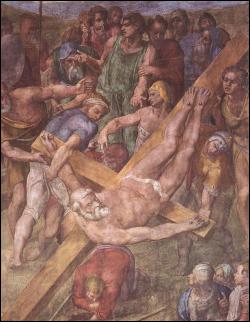从此以后,米开朗基罗每幅画或雕刻,仿佛都在铺陈自己面对上帝的心灵世界。世界 ── 管他是市民对教皇、权势家族的抗争,或罗马城的危难,渐渐都消退了,剩下的是他与上帝一齐面对自己的一生。他要让自己的一生摊平在上帝面前,跟上帝交谈并结案。 米开朗基罗有生之年的最后两幅画是教皇保罗三世委托米开朗基罗为自己私人教堂(保利纳)绘制的,两幅画都以色彩呈现神秘并模糊一片的荒原,完全背反了文艺复兴时代最洋洋得意的透视法。 其中一幅「圣保罗皈依图」,米开朗基罗再度用圣保罗「署名」,画下自己的脸。这个在路上与基督相遇,听到基督的声音,发现自己这一生拼命迫害的,竟然是基督,因而生命改变的使徒,体现着画家自己的宗教体验。 难道米开朗基罗发现了他这一生的抗争本身,是出于 对上帝的不够了解,他需要像保罗一样,重新与上帝相遇? 另外一幅「圣彼得受钉刑」,米开朗基罗将画面充满各种个样的人,他们面对一个圣徒为上帝殉道的事件,每个人都心不在焉的各有自己的打算,而米开朗基罗将彼得的眼光看向观画者,仿佛是在问观画者:「你呢?」这仍旧可以算是画家的遗嘱!
