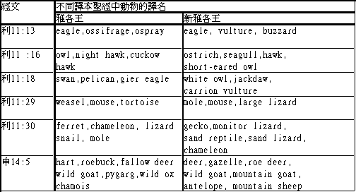 比较英文雅各王译本及新雅各王译本在利未记十一章所列动物的名字(它们都是根据同一个希伯来文原本及同样的译经原则译出)就知道现代这些动物的名字,十分不能确定。见表七。