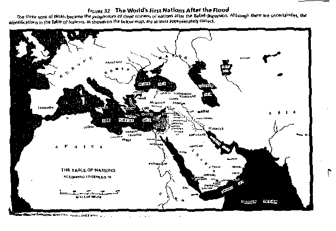 从创世记这些记录之中所得到的最明白的事实是,人类文明起源于中东,在亚拉腊山(位于现今的土耳其)及巴比伦(现今的伊拉克)附近。巴别塔之后列国的分散,可以相当程度的追溯到创世记第十章所记挪亚的后裔。这些原始的国家试着在图三十二的地图中加以辨识。一般说来,雅弗的各族都迁往欧洲西北。含的各族主要的迁徙到南方及西方进入非洲,及地中海东部地区,虽然,其中的一族,赫人,在西亚及土耳其建成了一个大帝国,其它的人可能去到远东。闪族则多少集中在中东。