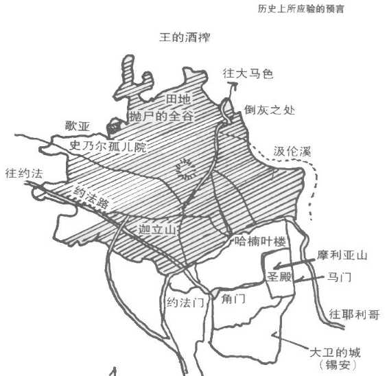 prophecies That Prove the Bible,pp.88-104)中谈到这项预言的应验,我们将戴氏的资料改写录在下面。10/88-104 耶利米用很清楚的路标,确定出此城扩张的范围。这些路标已存留了好几世纪,一直到最近耶路撒冷城扩建之后才除去。换句话说,这些标志是在先知预言应验以后才被拆毁的。 撒迦利亚书中也记载了一段有关耶路撒冷的预言,可用作补充耶利米未完之话,它记载在撒迦利亚书十四章第10节: 现在让我们一点点来追溯这项预言。某些耶路撒冷当年的路标,我们现在可能要用新的名称来代替,但我们尽可能保留与古耶路撒冷城有关的地理背景。耶利米时代的耶路撒冷城,其实是在今天耶路撒冷城的南方,从许多地图中我们都可看出这城一直是向北方扩张的。 现矗立在耶路撒冷城中的回教奥玛寺(Mosque of Omar),其西北角就是哈楠业楼,而今天的约法门(Joffa Gate)就是古代的“角门”。 上述这两处地方都是在耶路撒冷城内,且从耶利米时代到近代,都已扩建得差不多了。以后的扩张由城外开始,一直到迦立山,也就是角门的北边。这个地区自本世纪起才开始出售,大部分是被犹太人买去的。现在的迦立山已成为苏俄调停驻军的所在地,目前该区正顺着圣经指定的范围扩张。 史乃尔(Schneeller)孤儿院原来是一所德国的工业学校,正座落在歌亚山上。随着这所学校兴建,耶路撒冷城愈发往北方扩张。根据以下史东乐所绘制的地图,这里应属于4号区。直到不久以前,这一带还是新耶路撒冷城西北郊区发展的最北的极限。由于约法路(Joffa
