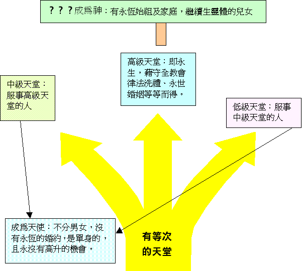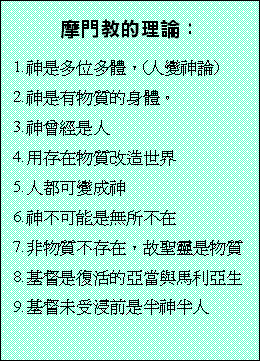 a)圣经 摩门教徒说他们“相信翻译正确的圣经”,但当圣经与摩门经有冲突时,则以摩门经作准。他们以圣经为 神给东半球的经典,摩门经为给西半球的经典。并以以西结书卅七:15-17 作根据。以犹太的□为“圣经”而以莲的□为“摩门经”,以接连成一根即两部经书同为耶稣基督作见证。 辩证:圣经以西结书中的预言是指向以色列家合一的问题,根本不是预言摩门经的出现。 b)摩门经 谤据摩门教的宣称为由史密约瑟得到天使摩罗乃的指引,又得乌陵和土明的帮助而翻译出来。摩门经乃由改良的埃及文所写成。 辩证: i)根据考得里奥利佛的后人考得里威里所著的“WHO REALLY WROTE THE BOOK OF MORMON”揭发摩门经乃根据一失意的牧师的构思小说改编而成,是因这牧师的手稿为出版社所拒绝出版,又因他逝世而留在这出版社中。及后为另一名离职牧师发现,想藉此故事吸引当时的信徒归向支持他,因而与史密约瑟合作制造了摩门经的面世。 ii)另摩门经中的话互相矛盾,因在摩门经中的尼腓二书预言李海的后裔中必兴起一人作先知,但摩门经的序言却以“摩门经是......由外邦人而问世,将 神藉著恩赐而译成。”而摩门经中又以李海的后裔尼腓族被杀尽,而拉曼族又被 神刑罚变作印第安人,那么怎会有史密约瑟这后裔出现?又怎么会是白种人呢?今天摩门教虽解释“犹太人即信主的外邦人”仍不能解决预言上的矛盾。 iii)摩门经中尼腓二书是被认为写于主前五五九至五四五年,怎可能叫人“跟从耶稣”呢?因主耶稣还要在五百多年后才降生,旧约中又没有预言主的名字叫“耶稣”,加上“耶稣这名是希腊文,在写尼腓二书的时候,希腊文化仍未普及,又加上摩门经以改良埃及人所写,怎会出现了希腊文的字句呢? iv)摩门教的改良埃及文说法不足信,因他们以这种文字是没有人可以阅读,与 神启示的方式不同, 神从不以一种人看不明白的文字来记录圣经的真理。 c)教义与圣约 为史密约瑟的得到的新启示,摩门教徒认为书中的启示是 神命令他们研读及遵守的。 辩正:摩门经指责多妻的恶行,又以多妻为 神所憎恶,又禁止人以亚伯拉罕及大卫等旧约圣徒作多妻的前例,但教义与圣约中却以这些圣徒作多妻的前例。若真是出于 神的启示又岂会是而又非,可见这二书明显不是 神的启示。 d)无价的珍珠 为史密约瑟自称于一八三零年六月及十二月间所得的启示,关乎摩西的写作及一些有关地球创造的资料。 辩正:史密约瑟以此其中的“亚伯罕书”;是从改良埃及文中翻译出来,但经由他们中间一位杰出的埃及语专家や杰姆尔逊博士所证实,这只不过是一个埃及的葬礼原文,并不是甚么亚伯拉罕书,并且や博士一家于一九七五年十二月八日离开摩门教,并称这个为种族岐视的教会。 2)论神: 摩门教在教义约一书中,以父神及主耶稣是有可以摸的骨肉身体,圣灵是没有骨肉的身体......并所有的灵都是物质,又妄用圣经林前八:5 的话而强称有许多的神。并且摩门教又以神是要先存的灵,经在地上得着肉身而得以进化为更高级的位置及可以享受到不同等级的天堂快乐。从而引进“人的进化为神”的概念,又妄用圣经创三:5 的话作根据。 辩正:摩门教前后期的教导矛盾,早期是一神论,后期是多神论,因想不通三位一体而推算出许多神来。根据约四:24的话“ 神是个灵”并不不是物质,因不明白圣经的记录手法而将 神看为物质的神。加上人变神论的出现,引致以人堕落才有快乐才可以得着肉身经历进化阶段。此为否认了人犯罪是可恶的事实,又将救赎的必需更改了。 3)复活: 摩门教将复活分作两类,第一是全部复活即所有的人;按普遍救赎论都会死后复活。第二是两次复活,第一次复活又分作三个时期,第一第二时期可以上高级天堂,第三时期可以上中等天堂,第二次复活的人只可以入下等天堂。只有一部份太坏的人才会灭亡。要上高级天堂的人必须要得到摩门教的婚姻新永约,中等天堂的人是接受摩门教或其他异教不知律法者或高尚而受蒙蔽的人。而低级天堂是不接受基督福音的人。 辩正:圣经没有三等天堂之分,这只是人的自高的心理作崇。他们所根据三层天的话而推论三等天堂是不合理又荒谬的事,并且婚礼是否比救赎及 神的主权更重要呢? 4)圣职: 他们制定了亚伦及麦基洗德圣职,从而发展出十二使徒职份大祭司及七十员,长老等麦基洗德圣职,又发展出十二执事、廿四教师、四十八祭司及主教的亚伦圣职。 辩正:旧约亚伦的祭司体系只有利未支派亚伦的后裔才可以担任,若摩门教徒真为以法莲的后裔,他们根本不可以担任此祭司的职任。而麦基洗德的祭司职任更不是一般人可以得到的,加上新约中信徒皆为祭司,根本不用再重拾旧约的祭司体系。 5)圣礼: a)一般洗礼:为摩门教徒的洗礼。 b)死人受洗:为死去的家人编定族谱,并且代他们受洗。他们有家谱中心,位于盐湖城东南方的一座花岗岩山洞中,并将家谱制成微型菲林。 辩正:圣经中论及死人受洗的事,不是指代已死去的人受洗,乃是指这些人活著时曾受洗,并不是指为死去的人代受洗。