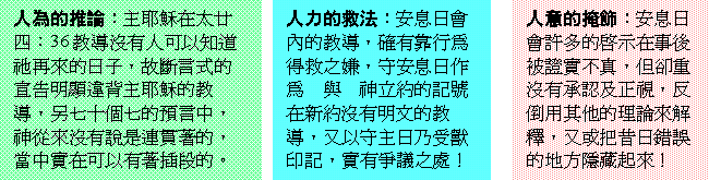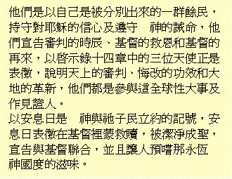 1)相近的信仰:安息日会除了以上的教义内,她与正统教会的信仰没甚分别。