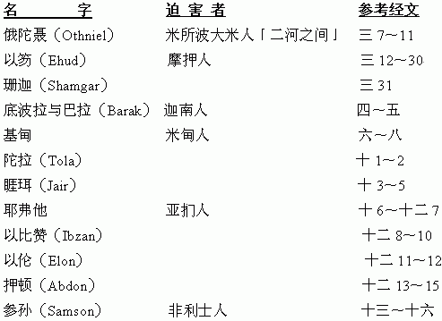 3.众士师:士师记的名字,来自神在这段时期所拣选的人,神要他们领导他的百姓。士师记二章16节说:「耶和华兴起士师,士师拯救他们」。其中大部份的士师,圣经明说他们「审判以色列」的时间长短。这荣誉的一群通常包括十二个名字: