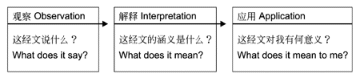 3. 什么是归纳法查经? 在世界各地以学生、学者为主体的小组查经聚会中,归纳法查经(Inductive Bible Study)是最通用的方式。所谓归纳法查经,就是先仔细观察一段经文,了解圣经说什么;再根据所观察的内容,解释这段经文的涵义;最后归纳出这段经文所启示的一般原则,应用于当今的生活中。