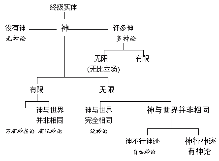 我们会逐一论及它们对神、世界、恶、神迹、价值或伦理的观点。下图乃根据逻辑上所有有关神的观点,将不同的世界观组织起来,图中每一构向面都回答下列有关神的一项基本问题: