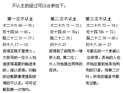 首先,就鸡叫的次数而言,只要我们能接受马可包含了一个其他福音书略去的细节,问题就不存在了。因为彼得本人可能便是马可写作素材的来源(他们在彼前五13中的关系密切),没有理由怀疑他在这方面的话。彼得在第一次不认主后可能注意到一次鸡叫。日后所以唯独他传述下来,而其他的门徒没有留意到这个细节,则因为这整件事彼得涉入最深,是他的切身之痛。