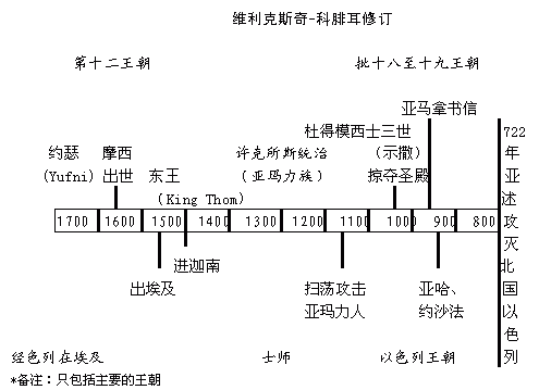 只要我们用以色列历史来定埃及事件的年代,出现的景象便能首尾一贯。如此的解释也使得必须为埃及历史重新编年。维利克斯奇对这种编年的处理备受批评,但科腓耳指出:埃及列王的世系并非一脉相承,例如世系上有些「王」实际上并非法老,而是地方统治者或高官,其中也提到约瑟(Yufni)和摩西的养父的名字(他乃因姻亲关系成为王子)。