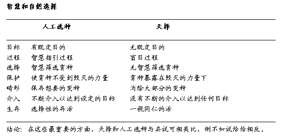 达尔文提出「天择」这个名词实在是大不幸,因为它引1发了许多思想上的混乱。他之所以会提出这个理论,当然是因为他经由研究人在家畜和农作物中人工选种的结果,而使得到的。他的用字完全没有问题。但是人工选种的作为与「天择」的作为不但无法类比,而且根本是完全相反的两回事……人有一个既定目标,「天择」则无。人按著他希望延续或加强的特征,来选择人希望交配的个体,不惜使尽一切力量,保护它们和它们的后代免受「天择」的运作影响,这样便可加速消除许多畸形变种;他继续积极并有目的地选种,一代又一代,直到达成他的目标(这个目标是可能达成的话)。这一种改变从未、也绝无可能在消灭或保留差异的盲目过程中发生,我们却误将这过程称为「天择」。(注9)